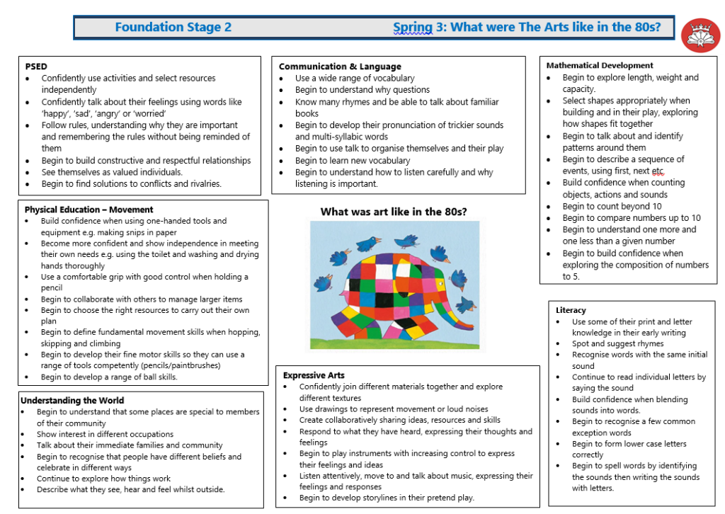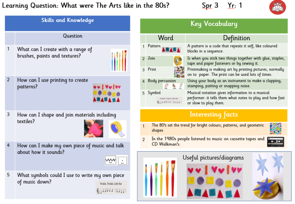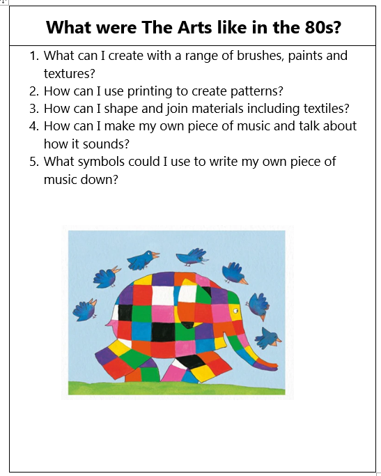 Our big question for Spring Term 3 is: ‘What were The Arts like in the 80s?’ Throughout the term, we’ll explore this vibrant era by discovering different styles, studying iconic creations, and noticing the patterns that made 80s art so unique. We’ll then use everything we’ve learned to create our own pieces. To finish the term in true 80s style, we’ll celebrate all our learning with an exciting 80s party!