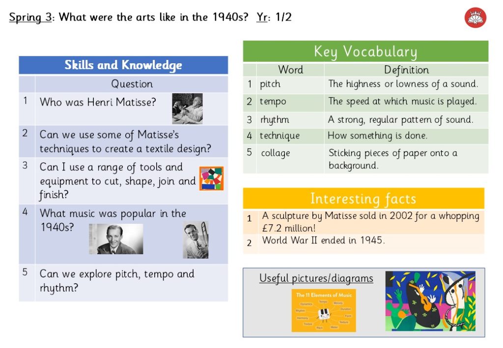 This is our arts term and we will be learning all about the artwork, music, designs and fashions that were popular in the 1940s. Our focus will be on the artwork of the French artist, Henri Matisse, whose new style of art first became popular in the 1940s. We will replicate some of his art, using the same techniques and styles as he did. Our class reading book, Luna Loves Art, will allow us to delve into and compare and contrast the work of other artists from this era. We will also use this book as a stimulus for our own writing adventures.