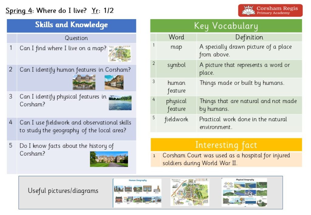 This term, we will explore the town of Corsham through both Geography and History. We will learn how to locate places on different types of maps and use these skills to find Corsham and its surrounding areas. We will investigate the physical features of the landscape and the human features that shape the town. In History, we will discover Corsham’s past, learning how the town has changed over time and what makes its heritage unique.